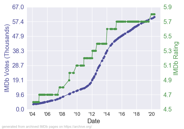 (Huh … I can’t really think of setting something like this with 2012-2014 shooting up and then levelling off after. I can’t really explain that. The rating is really a lot higher than I would have expected … I would have thought this would be in the low 5.0s at highest. So maybe a good sign for it being at least vaguely interesting?)