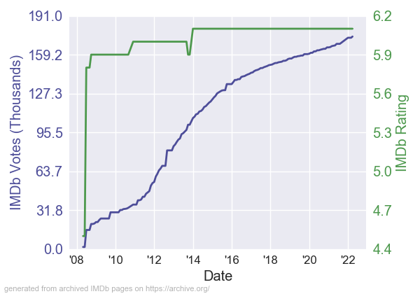 StreetCreditReport.com – BMeTric: top 24.0%; Notability: top 13.2%; Rotten Tomatoes: top 22.1%; Higher BMeT: Meet the Spartans, Disaster Movie, The Hottie & the Nottie, The Love Guru, Prom Night, One Missed Call, Superhero Movie, The Spirit, Zombie Strippers!, The Happening, College Road Trip, The Haunting of Molly Hartley, 10,000 BC, An American Carol, Meet Dave, The Mummy: Tomb of the Dragon Emperor, College, Space Chimps, First Sunday, Witless Protection, and 40 more; Higher Notability: The Day the Earth Stood Still, Eagle Eye, The Mummy: Tomb of the Dragon Emperor, New York, I Love You, Miracle at St. Anna, You Don’t Mess with the Zohan, Meet Dave, Jumper, Bedtime Stories, Drillbit Taylor, Semi-Pro, An American Carol, The Love Guru, The Happening, Superhero Movie, Seven Pounds, Made of Honor, 10,000 BC, Four Christmases, Max Payne, and 13 more; Lower RT: One Missed Call, House, Surfer, Dude, Disaster Movie, Meet the Spartans, Strange Wilderness, The Haunting of Molly Hartley, Witless Protection, College, The Accidental Husband, The Hottie & the Nottie, Babylon A.D., Prom Night, Bangkok Dangerous, 10,000 BC, Shutter, Hell Ride, Fool’s Gold, Deception, First Sunday, and 34 more; Notes: Clawing its way back to 6.0 which isn’t so bad. Not so bad at all. The Notability is pretty high I think for a comedy, probably a testament to the stacked cast.