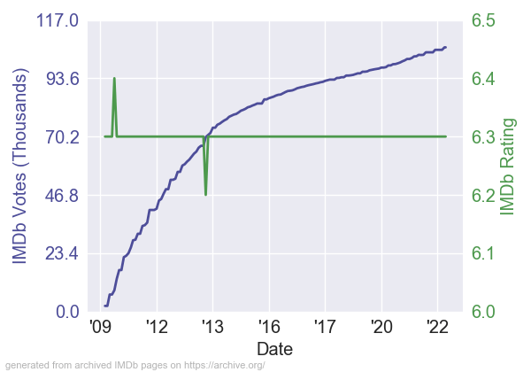 StreetCreditReport.com – BMeTric: top 25.6%; Notability: top 6.4%; Rotten Tomatoes: top 20.0%; Higher BMeT: The Last Airbender, Vampires Suck, Birdemic: Shock and Terror, Skyline, Sex and the City 2, Furry Vengeance, Jonah Hex, Gulliver’s Travels, Marmaduke, Cats & Dogs: The Revenge of Kitty Galore, Yogi Bear, Tekken, My Soul to Take, Tooth Fairy, Legion, A Nightmare on Elm Street, Why Did I Get Married Too?, Passion Play, The Back-up Plan, Killers, and 44 more; Higher Notability: Clash of the Titans, The Wolfman, Prince of Persia: The Sands of Time, Valentine’s Day, Sex and the City 2, The Tourist, Gulliver’s Travels, Marmaduke, Cats & Dogs: The Revenge of Kitty Galore, Tooth Fairy, The Last Airbender, Little Fockers, Shanghai, All Good Things, Eat Pray Love, Burlesque; Lower RT: Tekken, Passion Play, Twelve, 6 Souls, Shanghai, Vampires Suck, The Last Airbender, The Tortured, Waiting for Forever, Dylan Dog: Dead of Night, Furry Vengeance, 13, Crazy on the Outside, Marmaduke, Little Fockers, My Soul to Take, Saw: The Final Chapter, Killers, Grown Ups, Virginia, and 29 more; Notes: Love the Notability (how do you do that on a $30 million budget though?). The IMDb rating is stock still. 6.3 definitely in that “cult classic” territory where this film must have a decently devoted fanbase to it. Interesting, 17 films with higher Notabilities, and we’ve only seen five of them. That is crazy to think about.